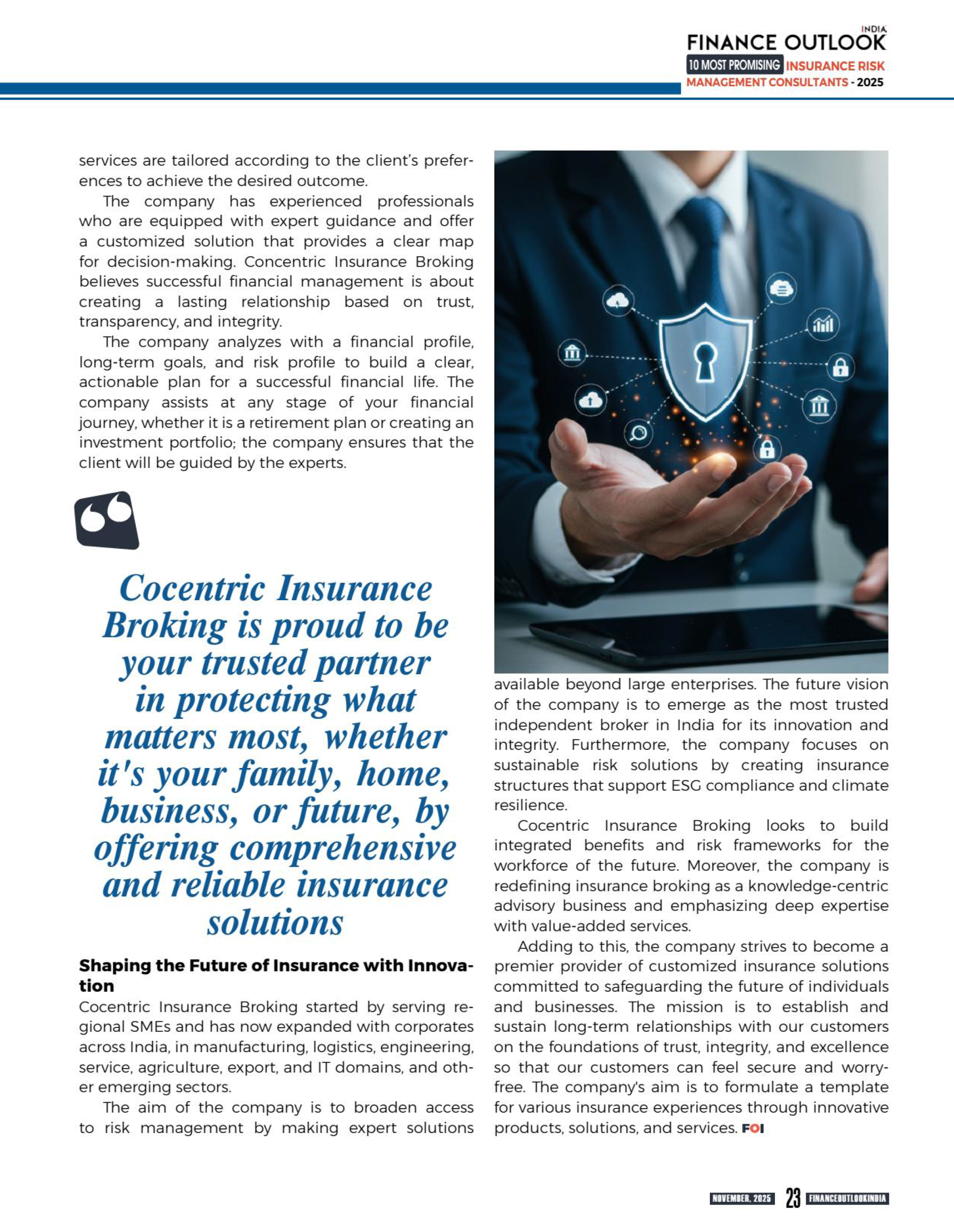 “At Cocentric Insurance, we are honored to be your trusted partner in safeguarding what matters most to you. Whether it’s protecting your family, your home, your business, or your future, we are here to provide you with peace of mind through comprehensive, reliable insurance solutions."